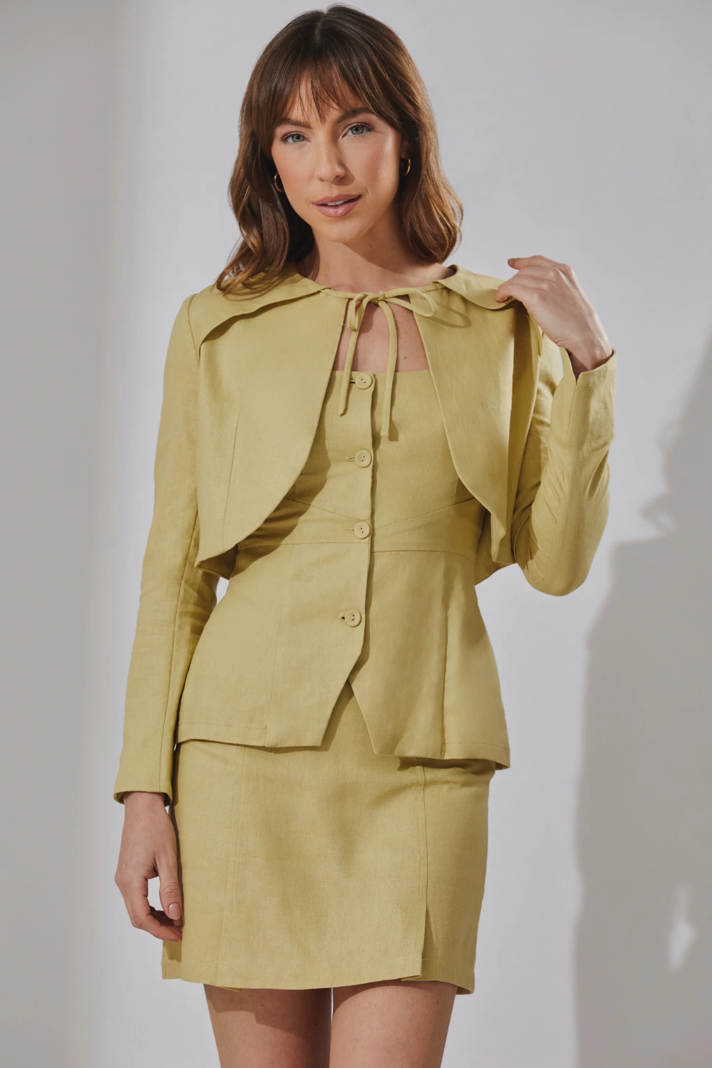 O Bolero Spencer Vinci, tem os mesmos elementos arredondados e olíquos da obra "Homem Vitruviano" tanto na parte frontal como nos punhos da peça. Seu fechamento é em amarração.