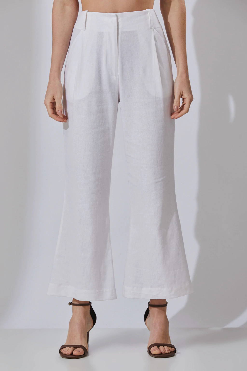 Calça de alfaitaria sem cós e cintura média. Possui passantes que possibilitam o uso com cintos, além de ter bolsos faca embutidos nas pregas e bolso verdugo na parte posterior. Seu fechamento é por zíper na braguilha com colchete no cós e botão de segurança interno, garantindo um ajuste seguro.