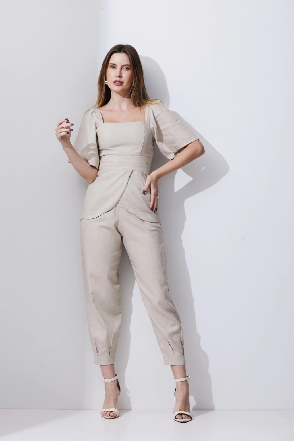Calça cenoura com cintura alta. Possui passantes no cós e pregas na parte frontal superior e na barra, gancho alto e bolsos faca embutidos nas laterais. Seu fechamento é por zíper na braguilha com colchete no cós e botão de segurança.