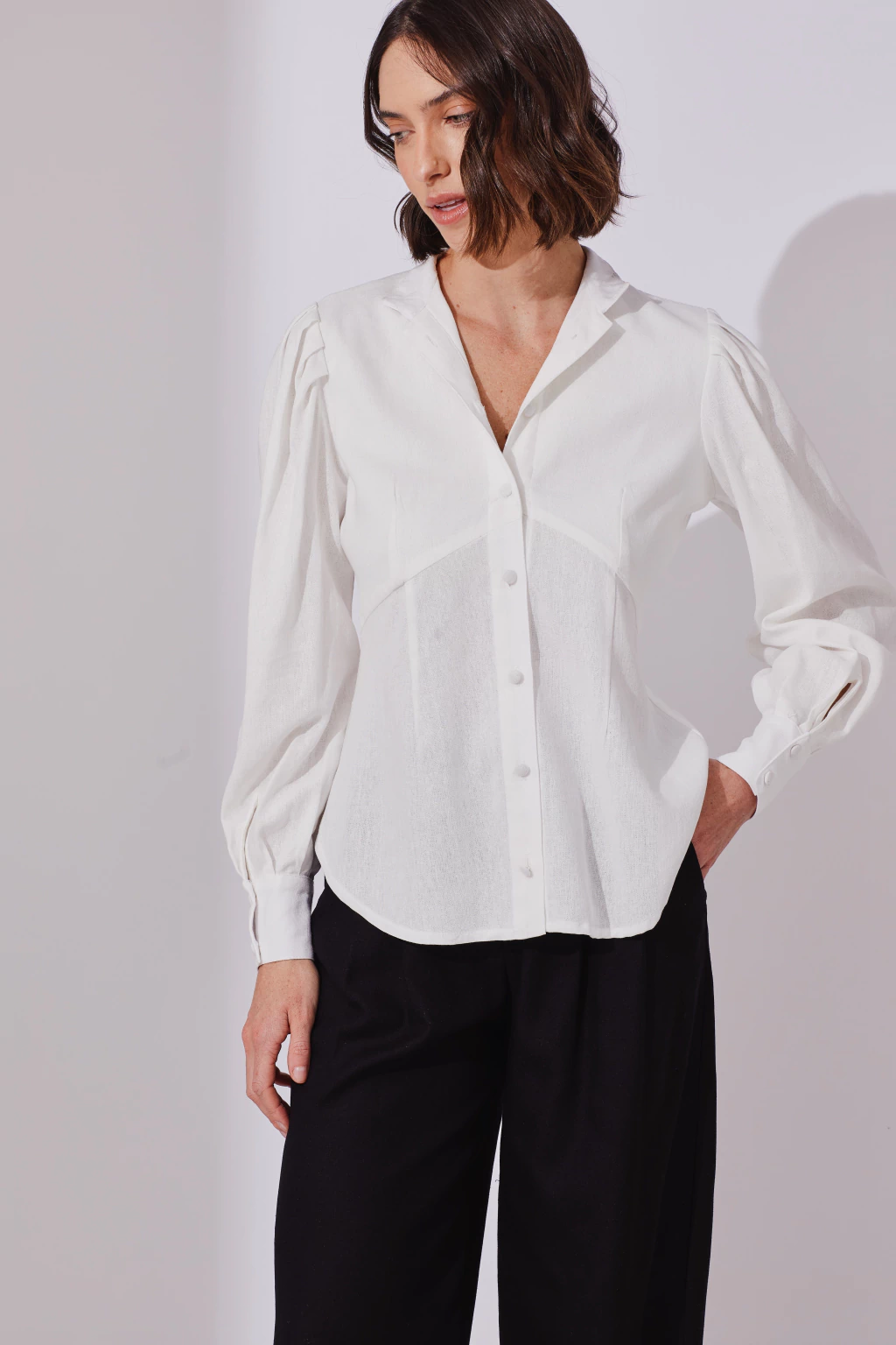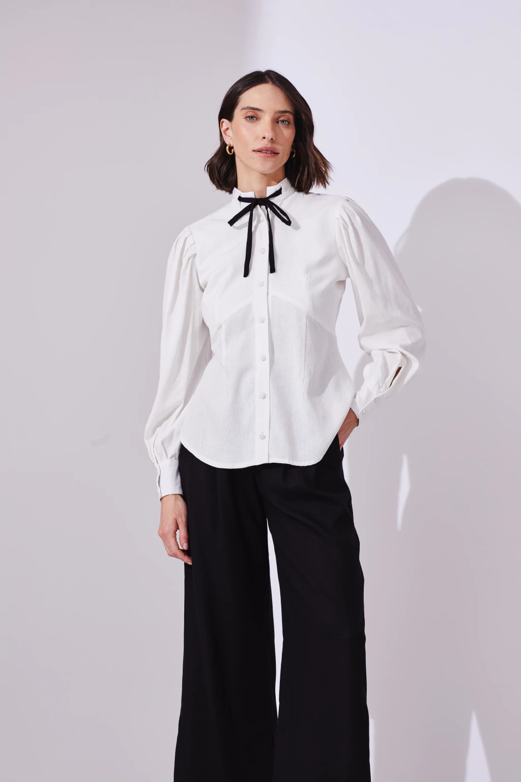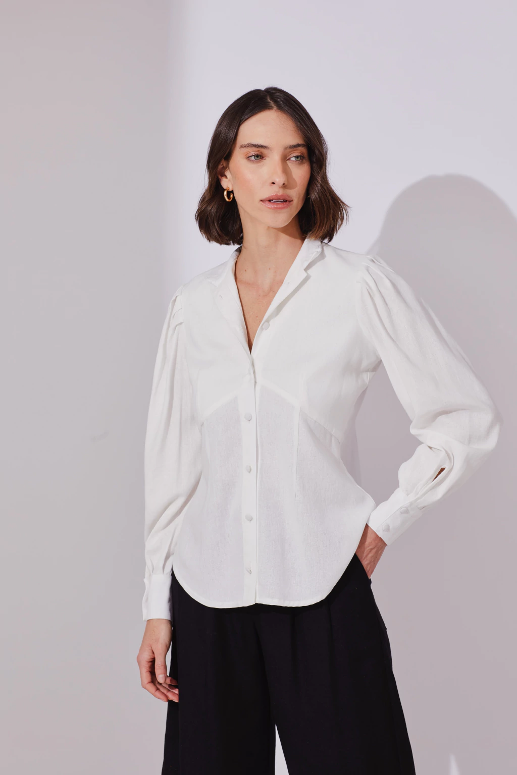 Camisa com recorte acinturando a peça, possui mangas bufantes e punho com fechamento em botões forrados, possui gola com fita removível e barra fraldada.