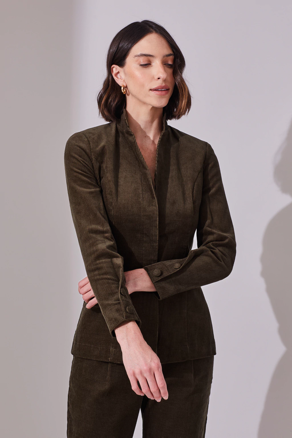 Casaco Velvet Mate - Verde Musgo, foi desenvolvido com uma modelagem acinturada, seu fechamento é feito por botões internos com vista para sobrepor, possui uma gola alta arredondada, que realça e acompanha o decote, permitindo que você use com a gola levantada ou abaixada, conforme seu estilo. Os punhos com detalhes em botões forrados e as ombreiras internas conferem uma postura a mais, ideal para compor looks que se destacam.