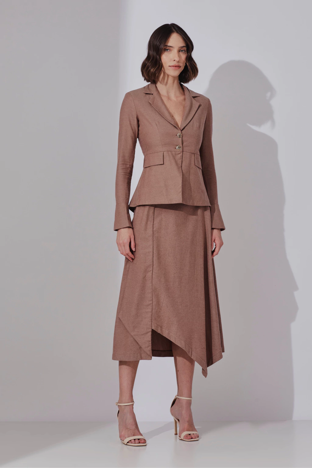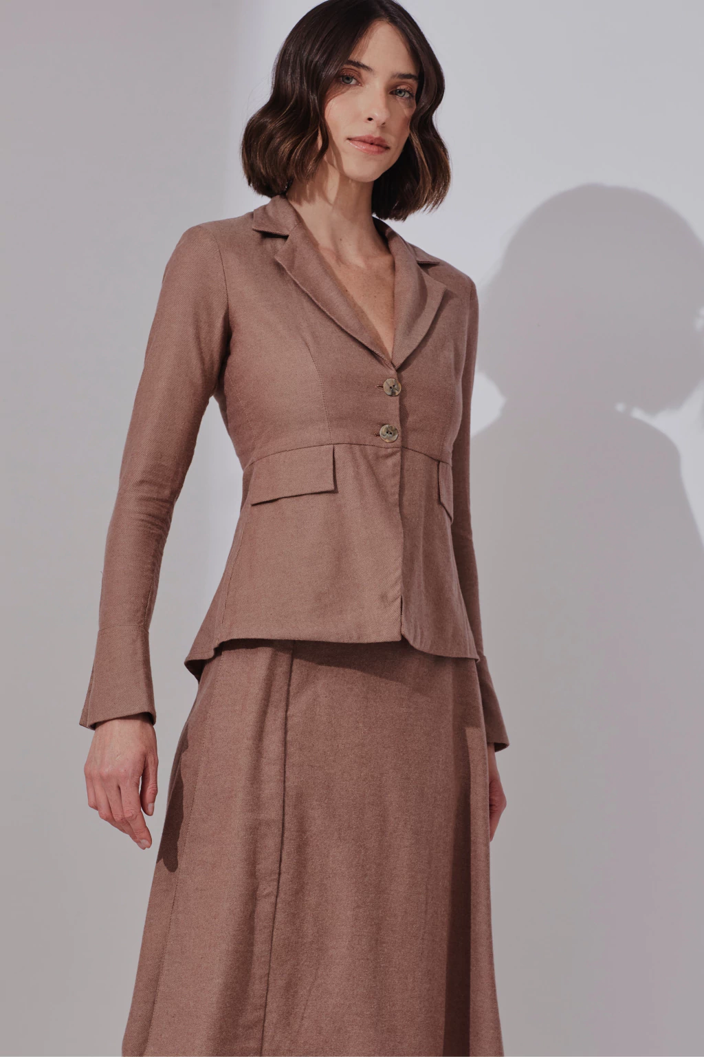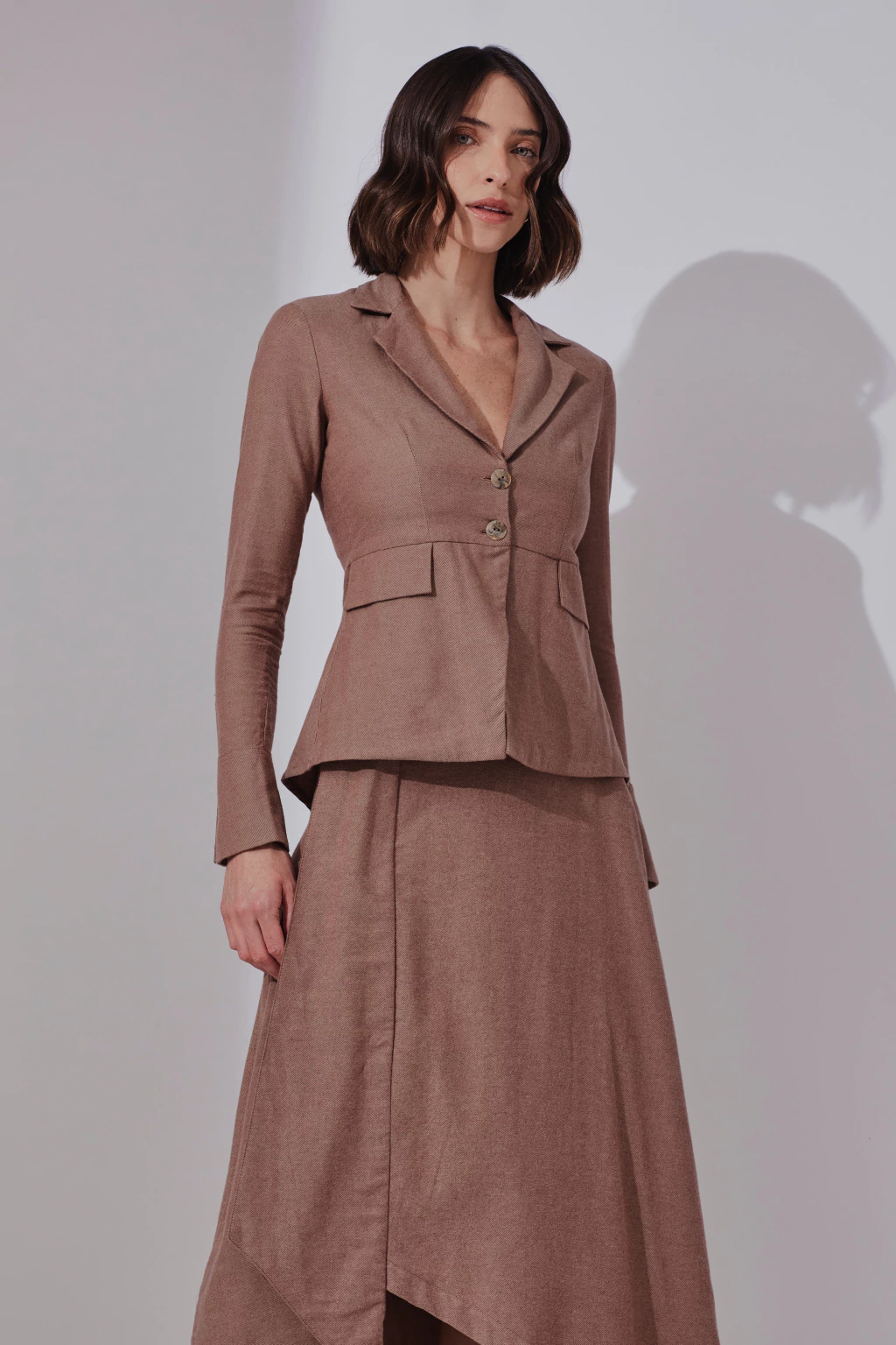 O Casaqueto Twill Coxilhas na cor Mescla Brown é a escolha perfeita para quem busca leveza e conforto, sem abrir mão da elegância. Com um recorte na cintura que valoriza a silhueta, o que deixa peça ainda mais acinturada. Possui lapelas nas laterais, com botões mesclados no centro e nos punhos, que são dublados possibilitando utilizar com as mangas dobradas. As ombreiras proporcionam estrutura, fazendo deste casaqueto um item indispensável no seu guarda-roupa.
