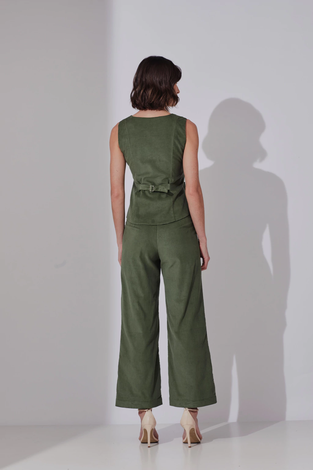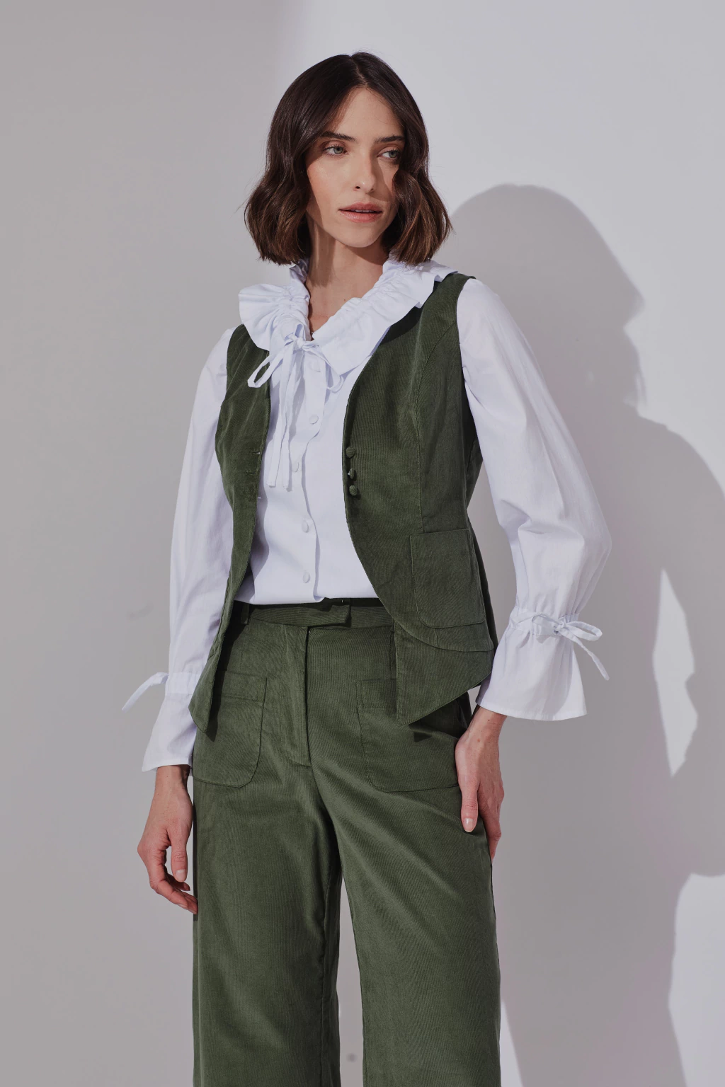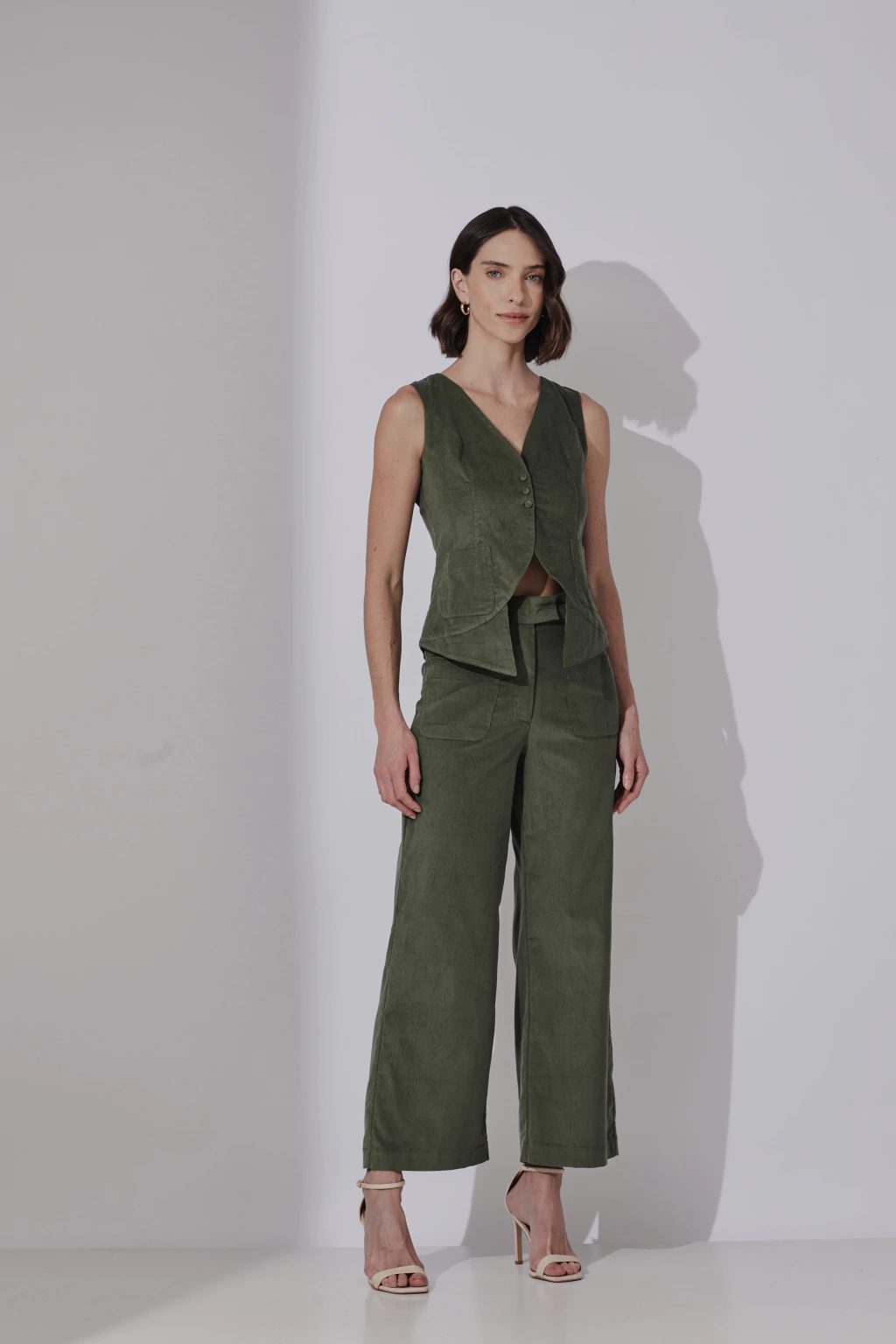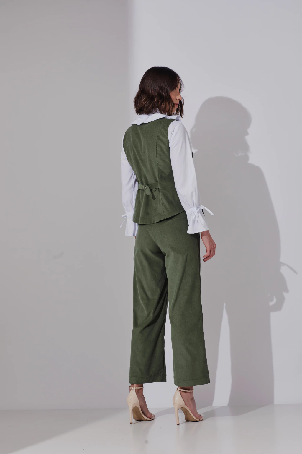 Com a Camisa Sixtie e a Calça Velvet Grass, criando um conjunto harmonioso que transita entre o casual e o chic.