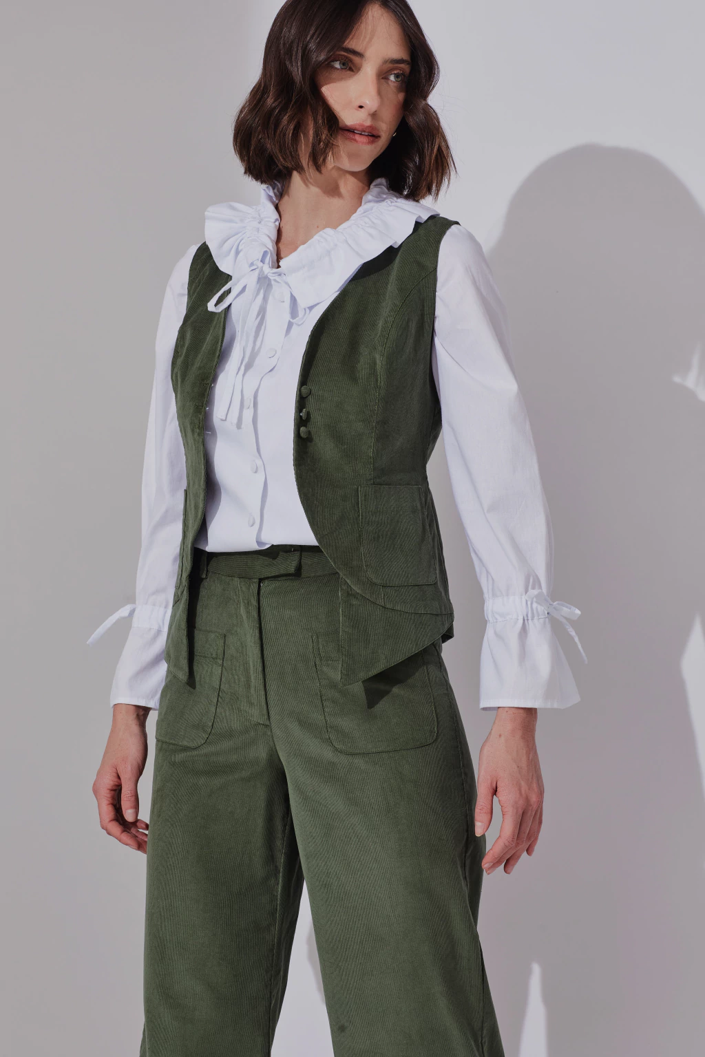 A Colete Velvet Grass, possui corpo arredondado com detalhe inferior duplado que alonga a peça. Com seus bolsos aplicados frontais e cantos arredondados. Seu fechamento é por botões forrados no centro. Possui aleta com regulador na parte posterior.