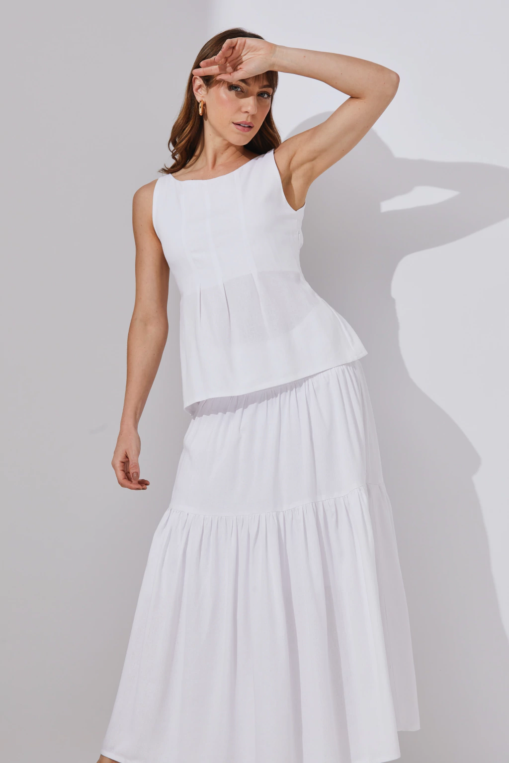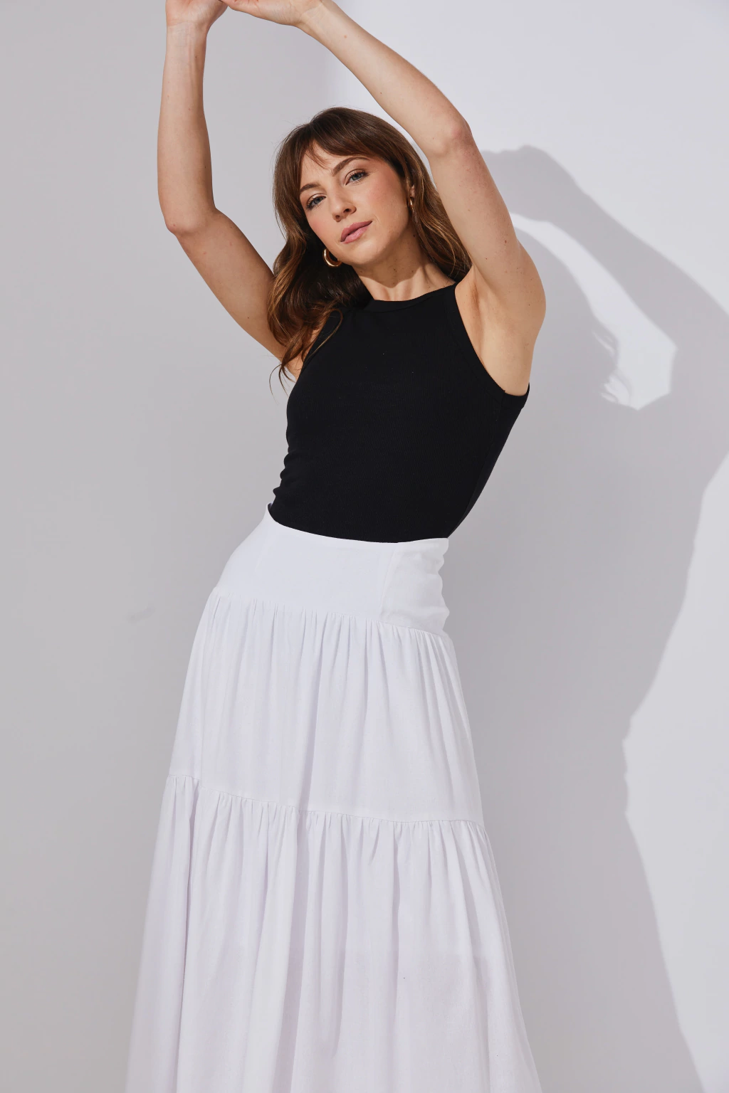 Saia midi com cós largo, duplo e arredondado, parte inferior franzida em duas camadas. A saia madrepérola possui bastante amplitude e movimento, uma peça chave para compor seus looks de verão.