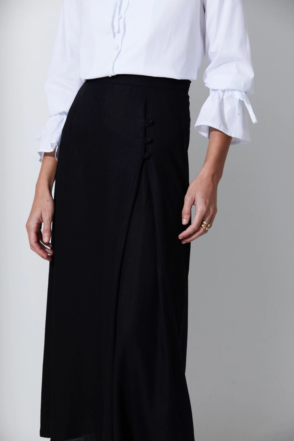 Saia midi evasê com recorte e detalhe de tecido embutido, que dá profundidade e movimento para a peça. Os ajustadores em botões decidem a amplitude e formam um novo visual, possui fechamento em zíper na parte posterior e pences que modelam o corpo.