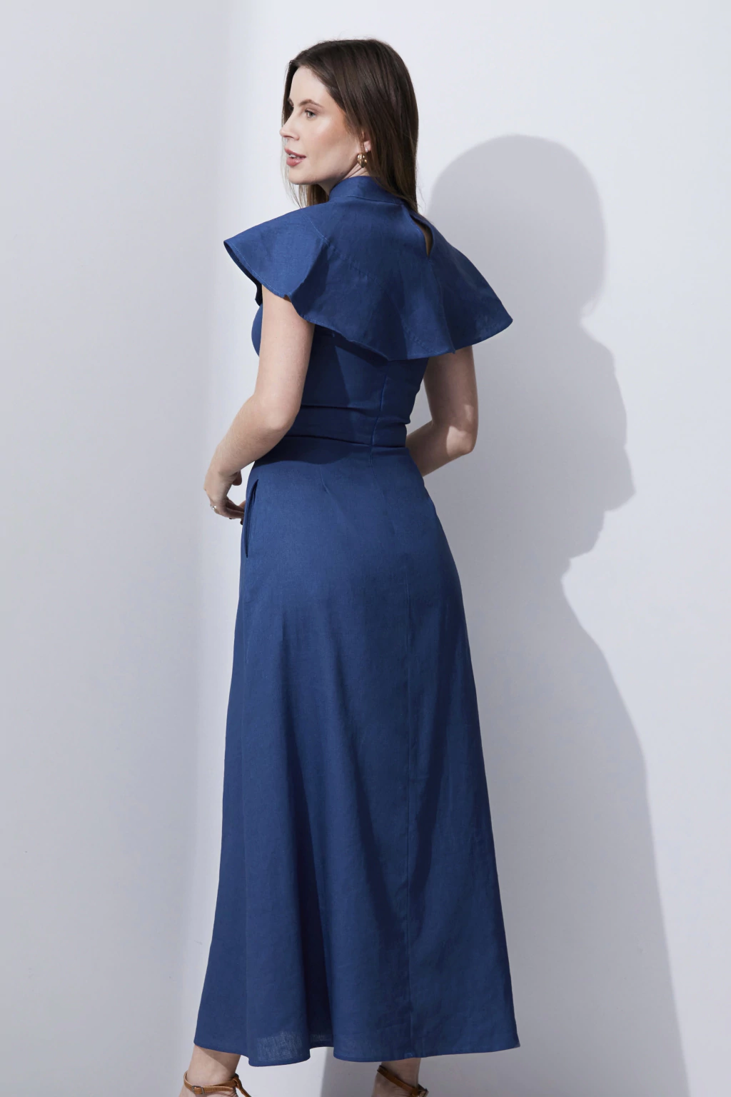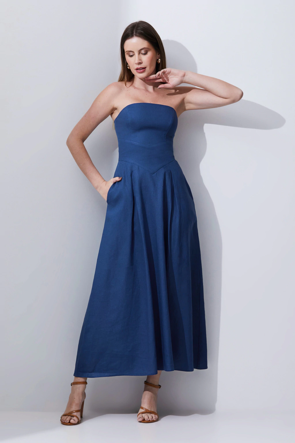 Vestido midi sem alças com recortes frontais em "v" na cintura e duas pregas na parte inferior, fechamento em zíper invisível.