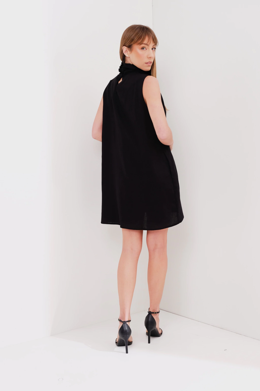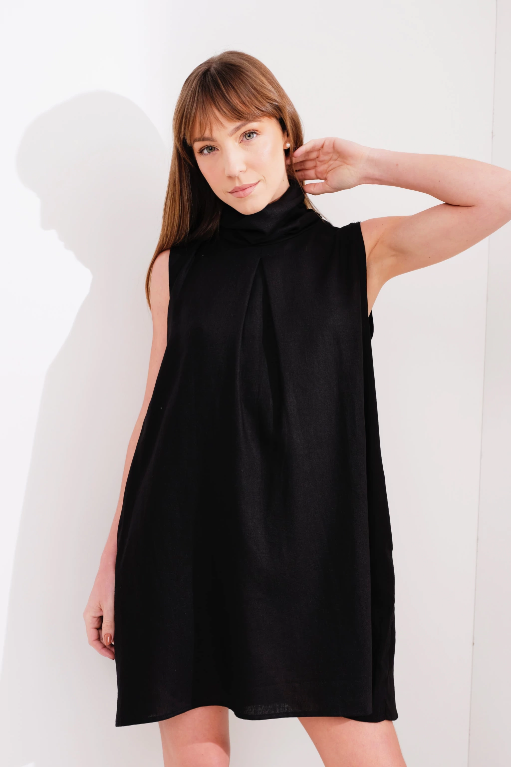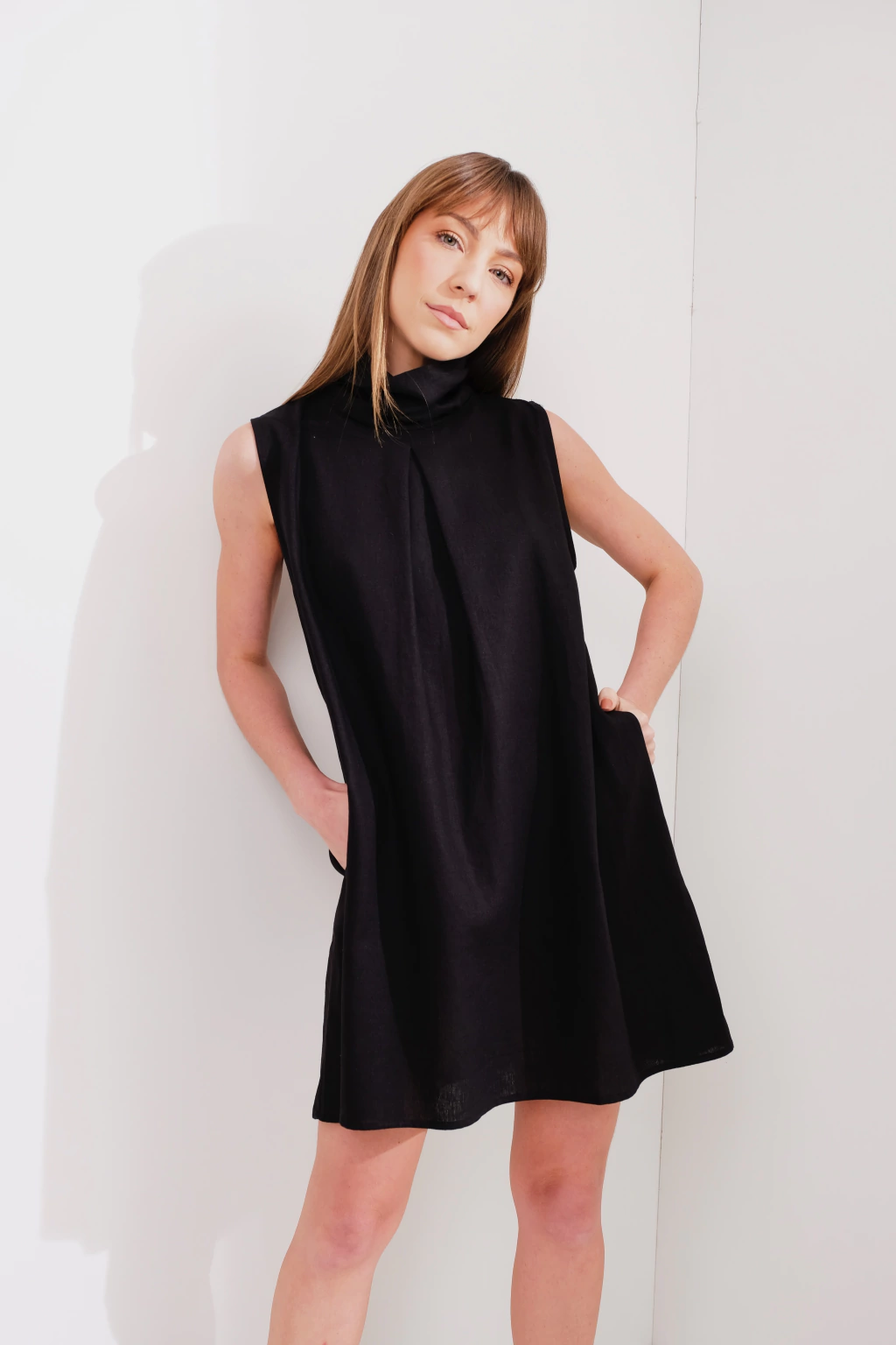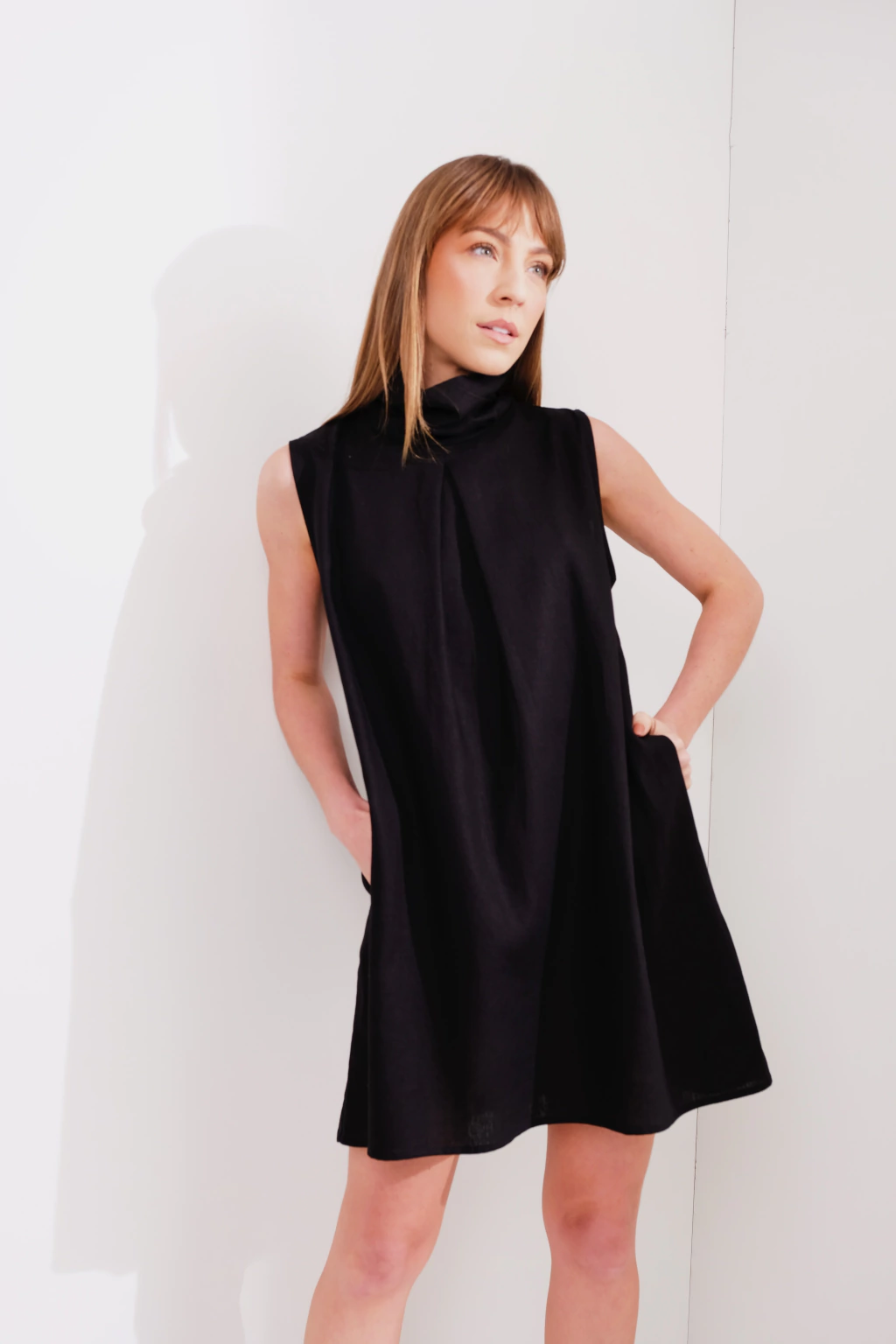 Vestido curto evasê de bastante amplitude, com prega frontal e gola alta, possui fechamento em botões forrados. Bolsos laterais, para trazer práticidade. Parte posterior com assimetria para um maior comprimento e segurança para movimentar-se.