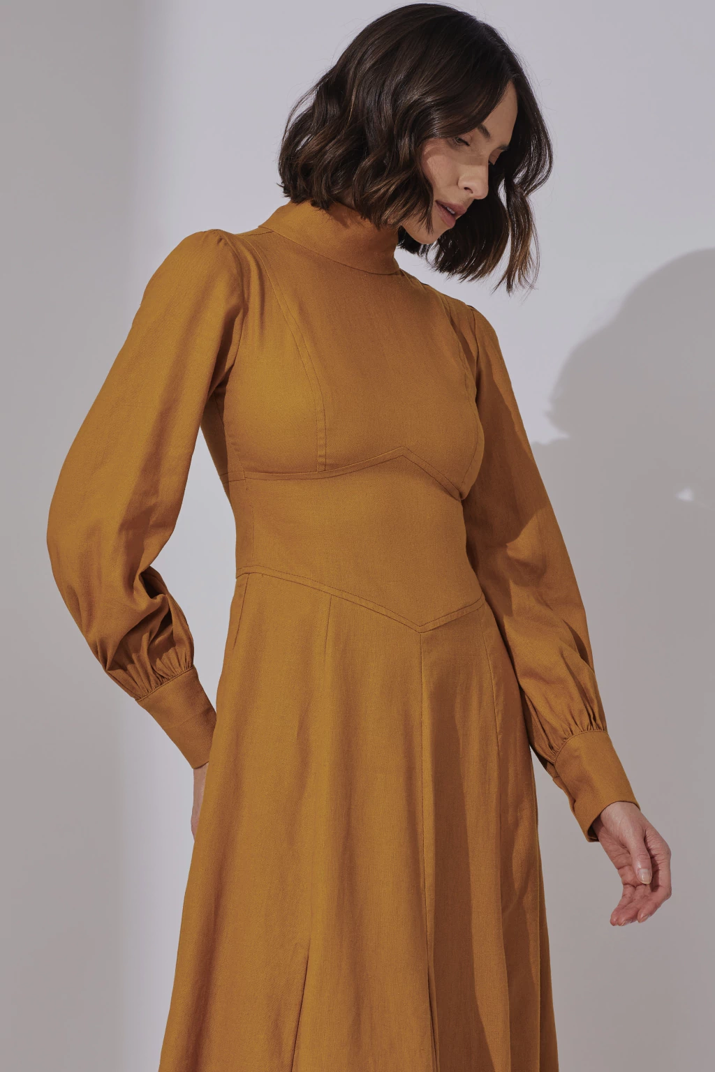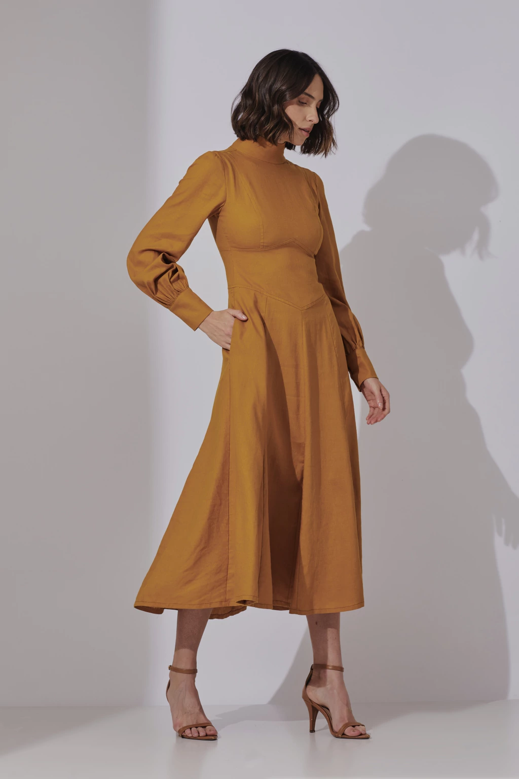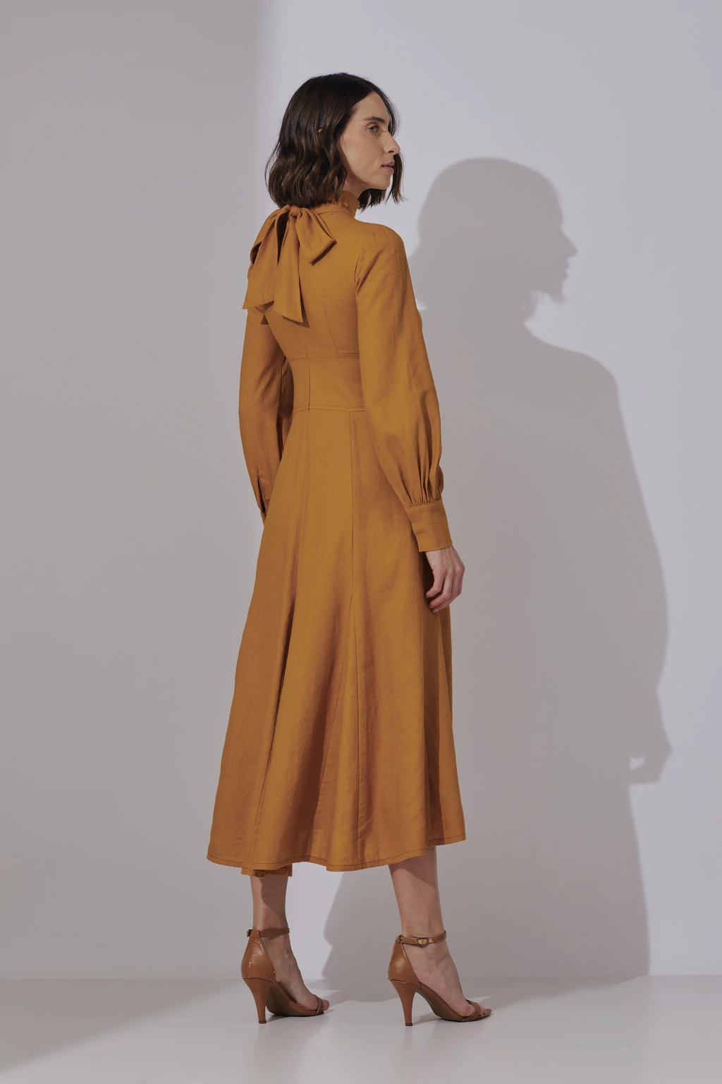 Com sua gola em amarração, você pode criar diferentes estilos. O detalhe geométrico na cintura modela perfeitamente o corpo, enquanto as mangas bufantes com botões forrados adicionam um toque de sofisticação. Sua parte inferior, com gomos triangulares, proporciona leveza e movimento, tornando cada passo um verdadeiro deslizar.