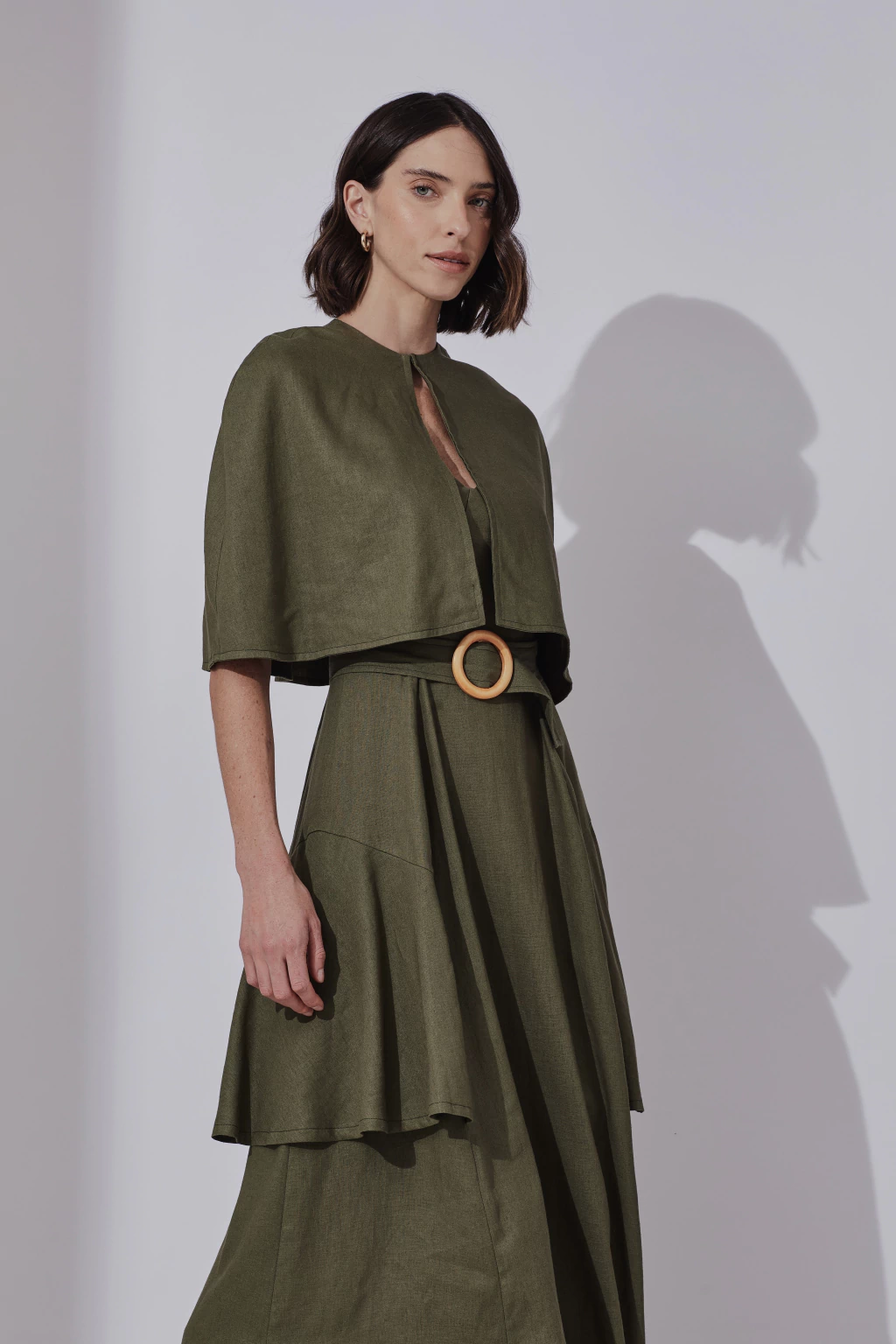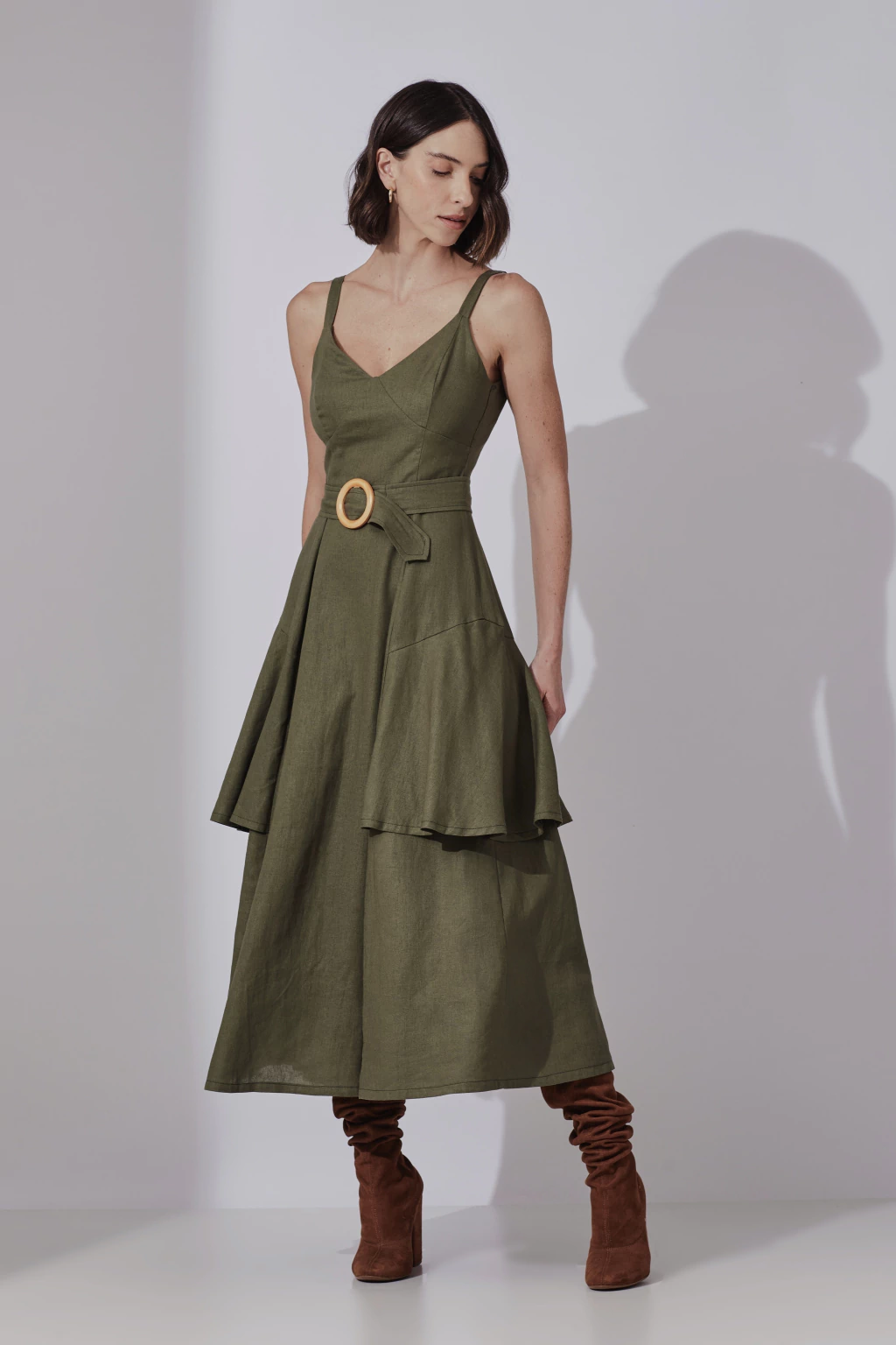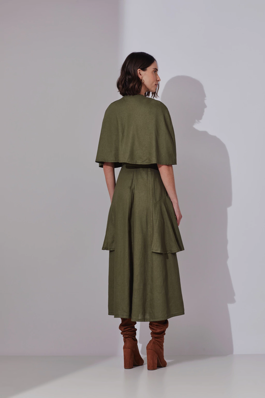 Vestido Com Pelerine Campo - Verde Army, com o comprimento longo e recorte triangular no busto, possui alças com regulador, garantindo um ajuste perfeito ao seu corpo. A parte inferior, com camadas em godê nas laterais, proporciona um movimento fluido. Acompanhado de um pelerine duplo que eleva o visual, este vestido apresenta um fechamento por zíper invisível na parte posterior e cinro com fivela de madeira para complementar difirentes visuais.