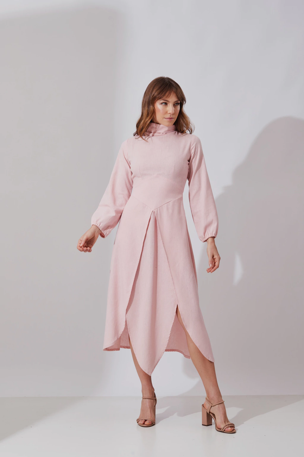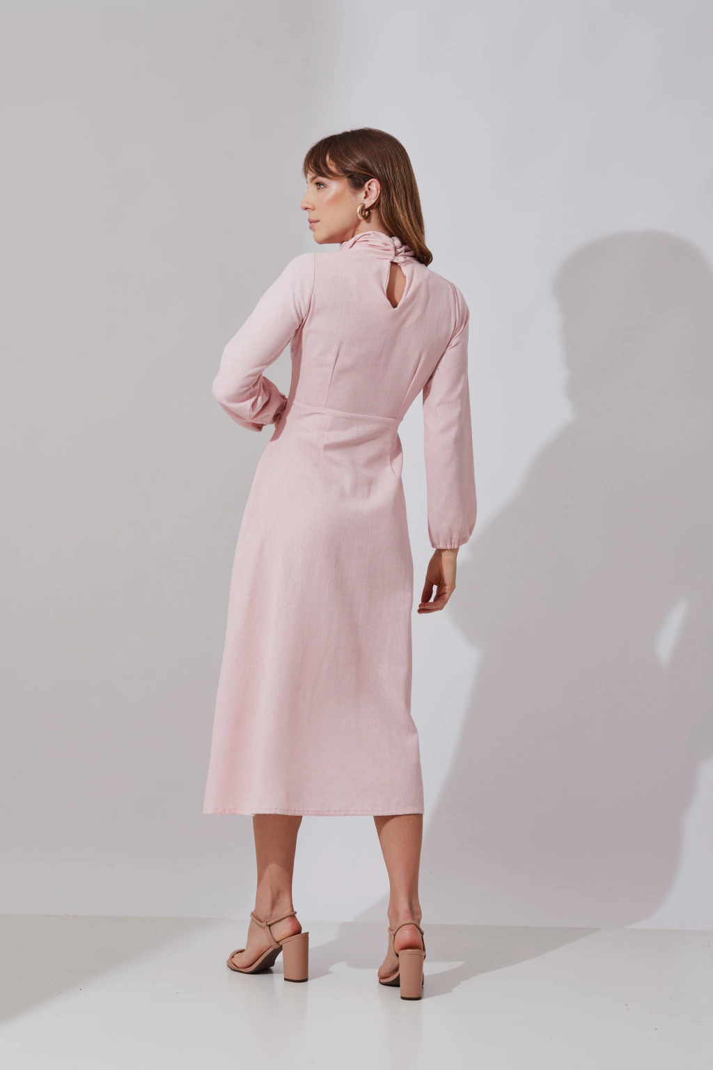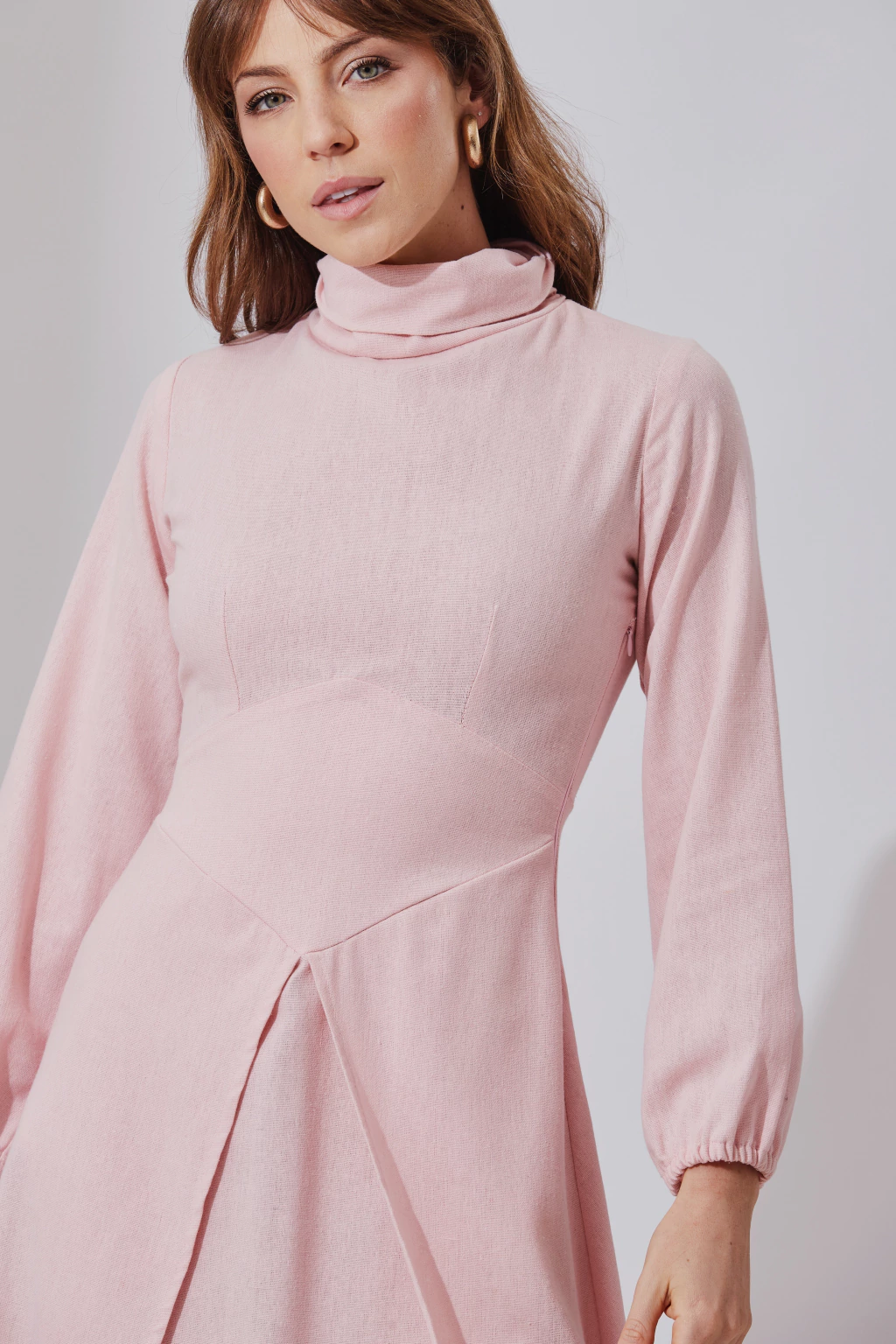 Vestido com recortes frontais inferiores, possui detalhe geométrico e mangas bufantes, fechamento em zíper invisível lateral