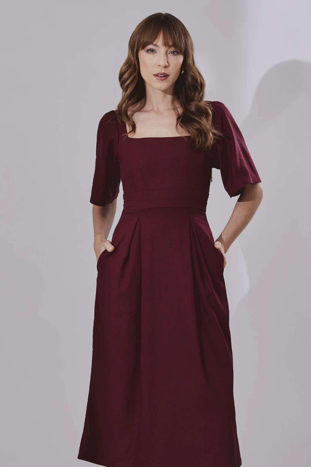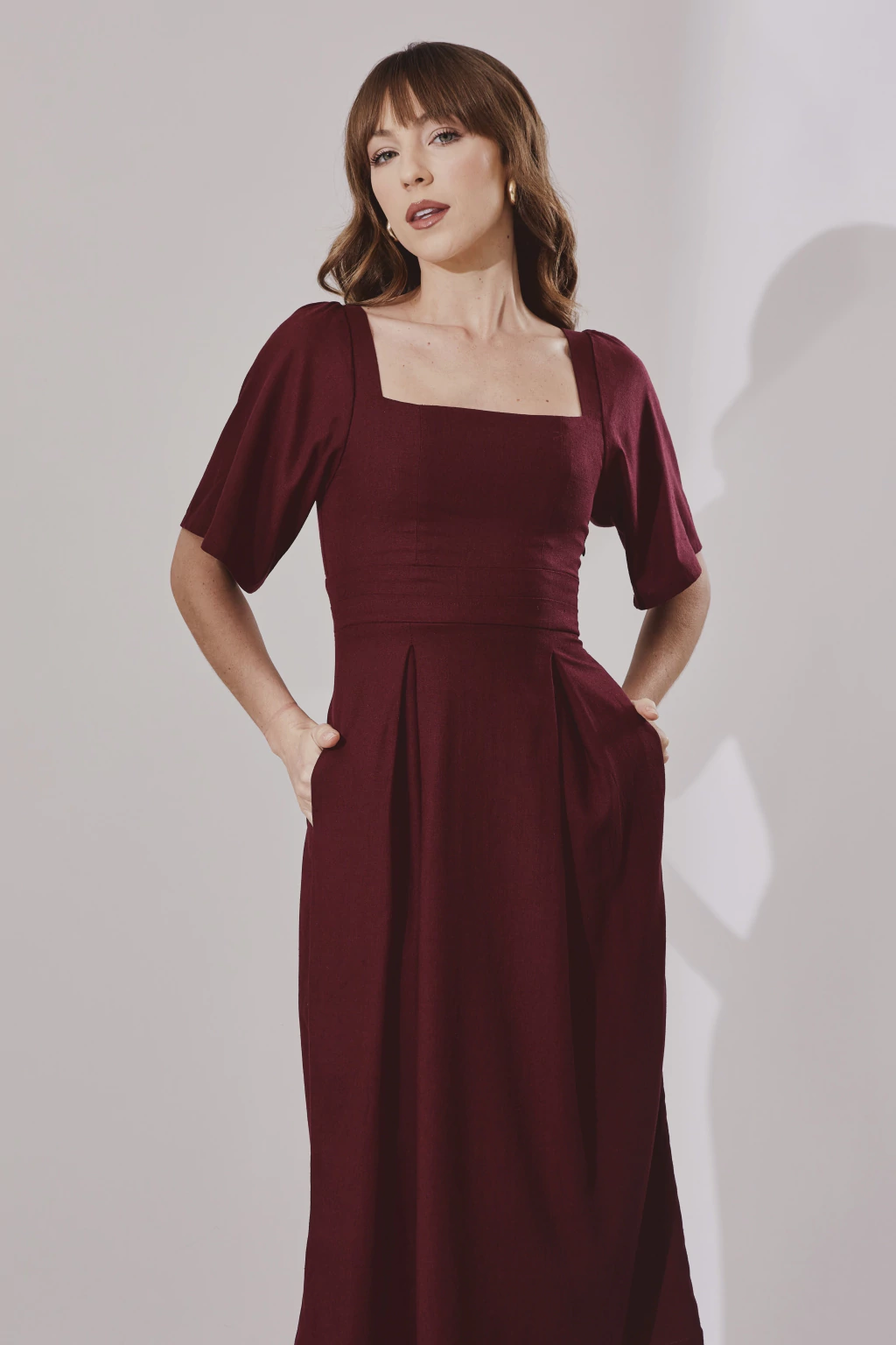 Vestido midi com decote quadrado, alças com elástico para dar maior firmeza e sustenção, mangas amplas, possui duas pregas na parte inferior, fechamento em zíper invisível lateral.